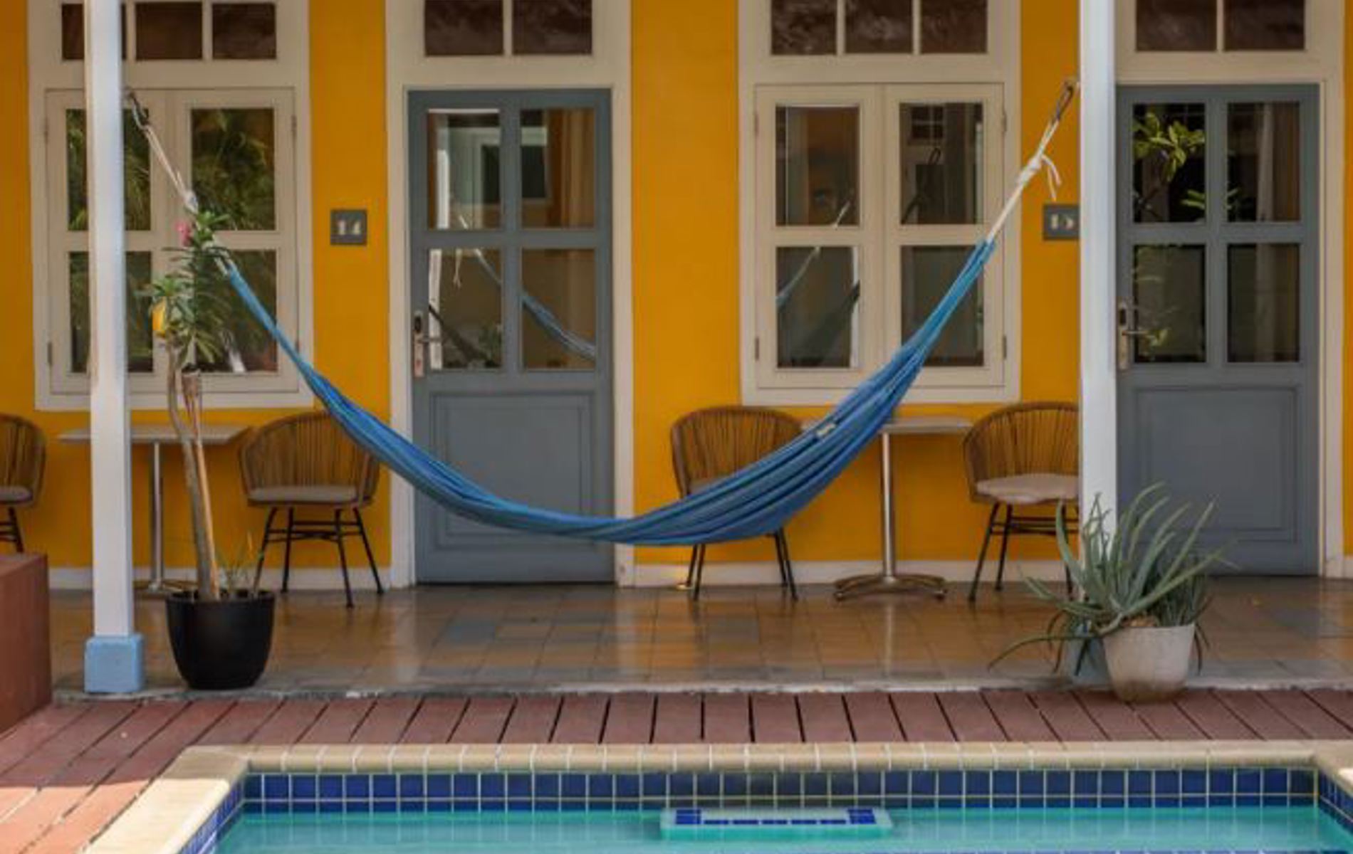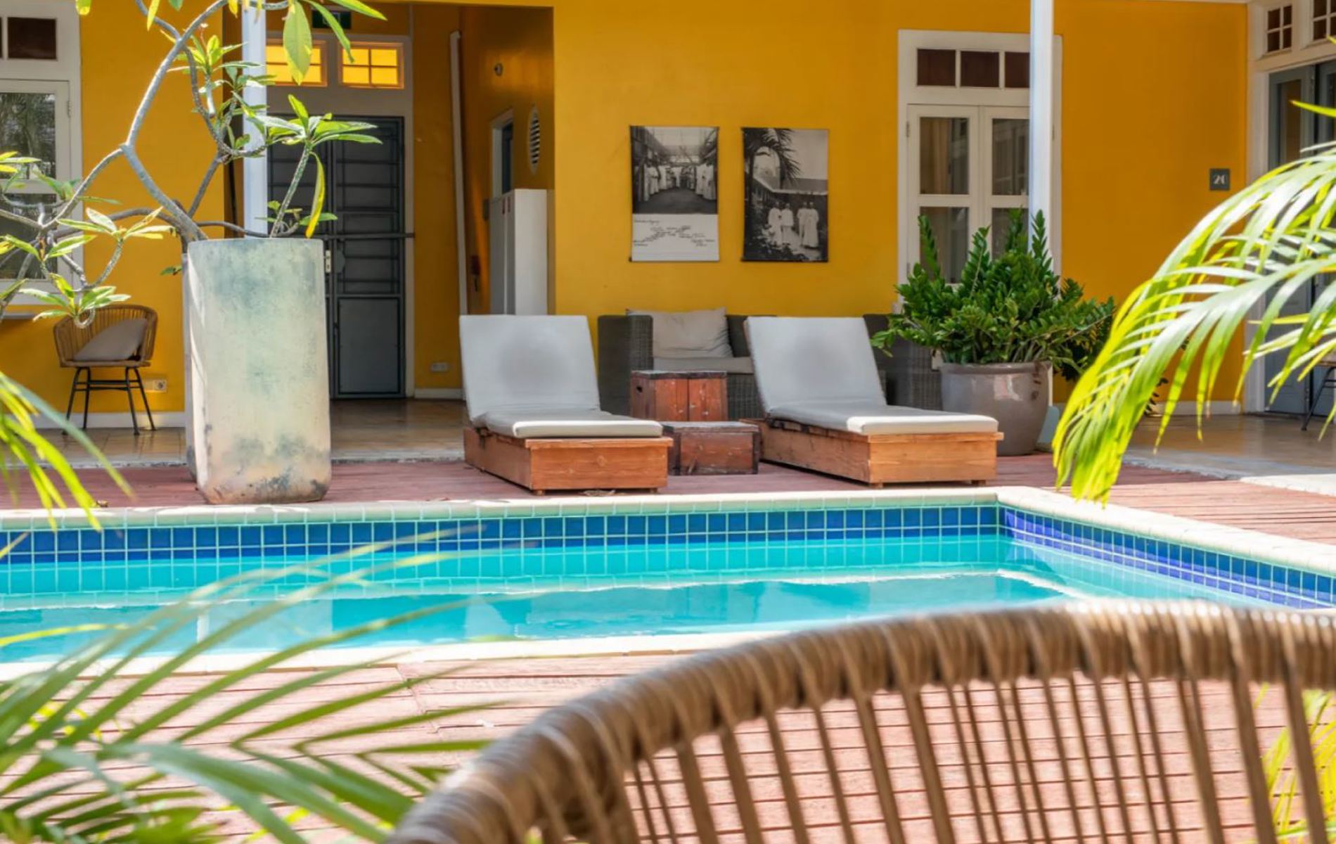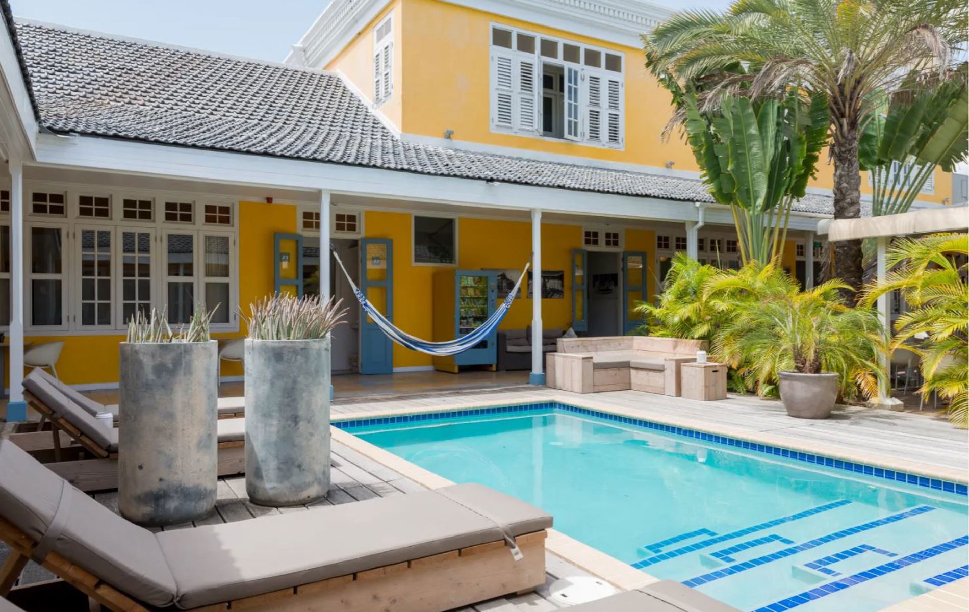 Træd ind i den hyggelige gårdhave, hvor palmerne svajer let, og hvor poolen indbyder til en forfriskende pause fra solen. Her kan I slappe af i hængekøjerne eller finde ro i loungeområdet med en god bog eller en kølig drink.