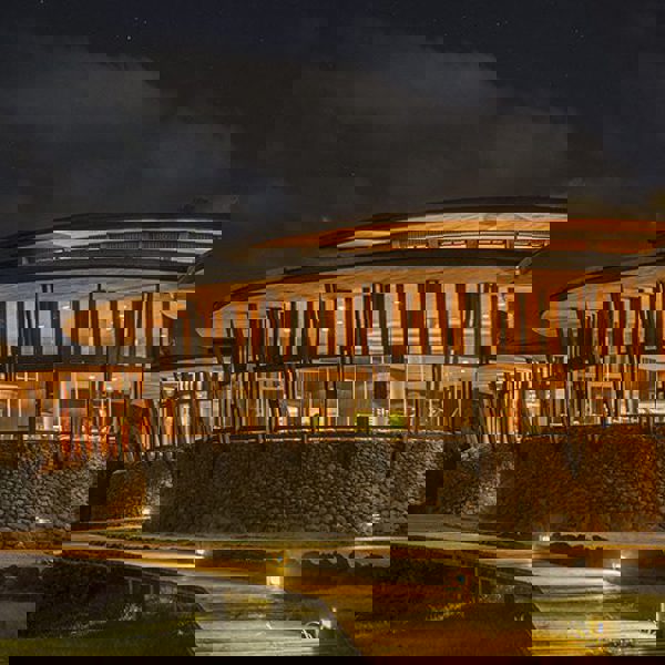 Selve hotellet er en sand oase af naturmaterialer, placeret på en 9 hektarer stor grund med havudsigt og ca. 10 minutters kørsel til byen, Hanga Roa. Alt er lavet i det smukkeste træ eller sten i flot design og med store, lyse fællesarealer, hvor man kan høre guiderne holde foredrag, tale om dagens eventyr med guider og andre rejsende samt en stor restaurant, bar, spa og pools til gæsternes nydelse.